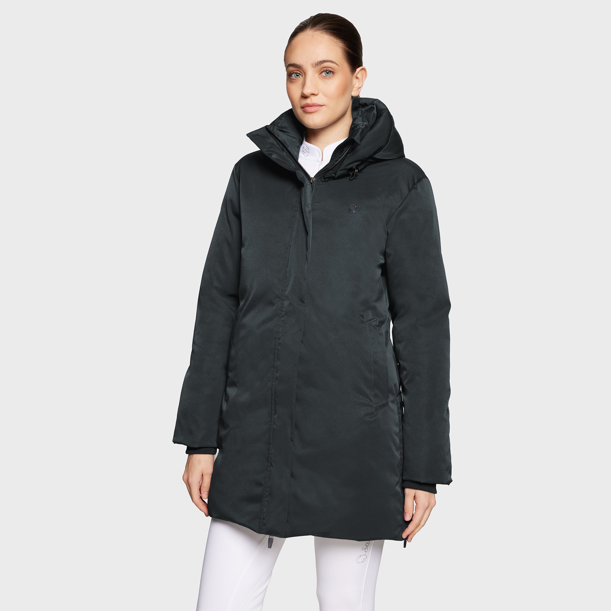 De jas is voorzien van een afneembare capuchon, een volledige ritssluiting en een zachte fluwelen binnenkraag voor extra comfort. Het zwarte chromen Samshield-blazoen op de voorkant voegt een luxueus accent toe, terwijl de openritsen aan de zijkanten flexibiliteit en bewegingsvrijheid bieden. Praktische details zijn dubbele zakken aan de voorkant, een hoge kraag en een binnenzak op de borst.