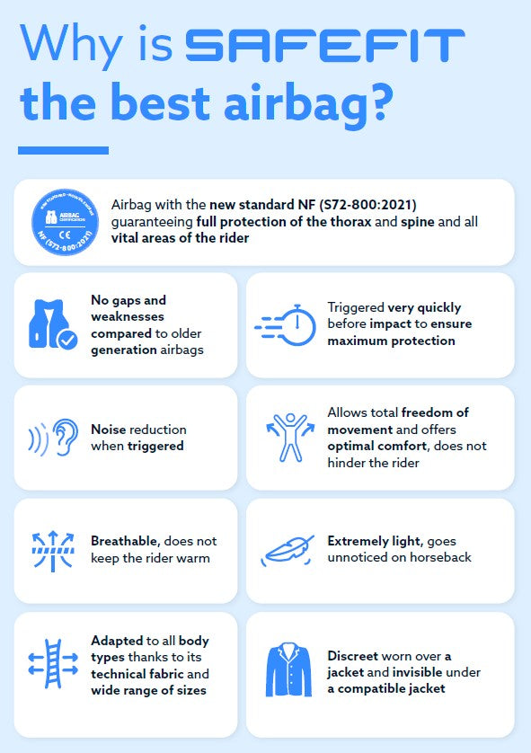 Bij een val zorgt het SAFEFIT-airbagvest voor totale bescherming van de vitale delen van uw lichaam (nek, thorax, rug, ribbenkast, lendengebied, bekken en heiligbeen) dankzij de ultrasnelle activering vóór de impact.