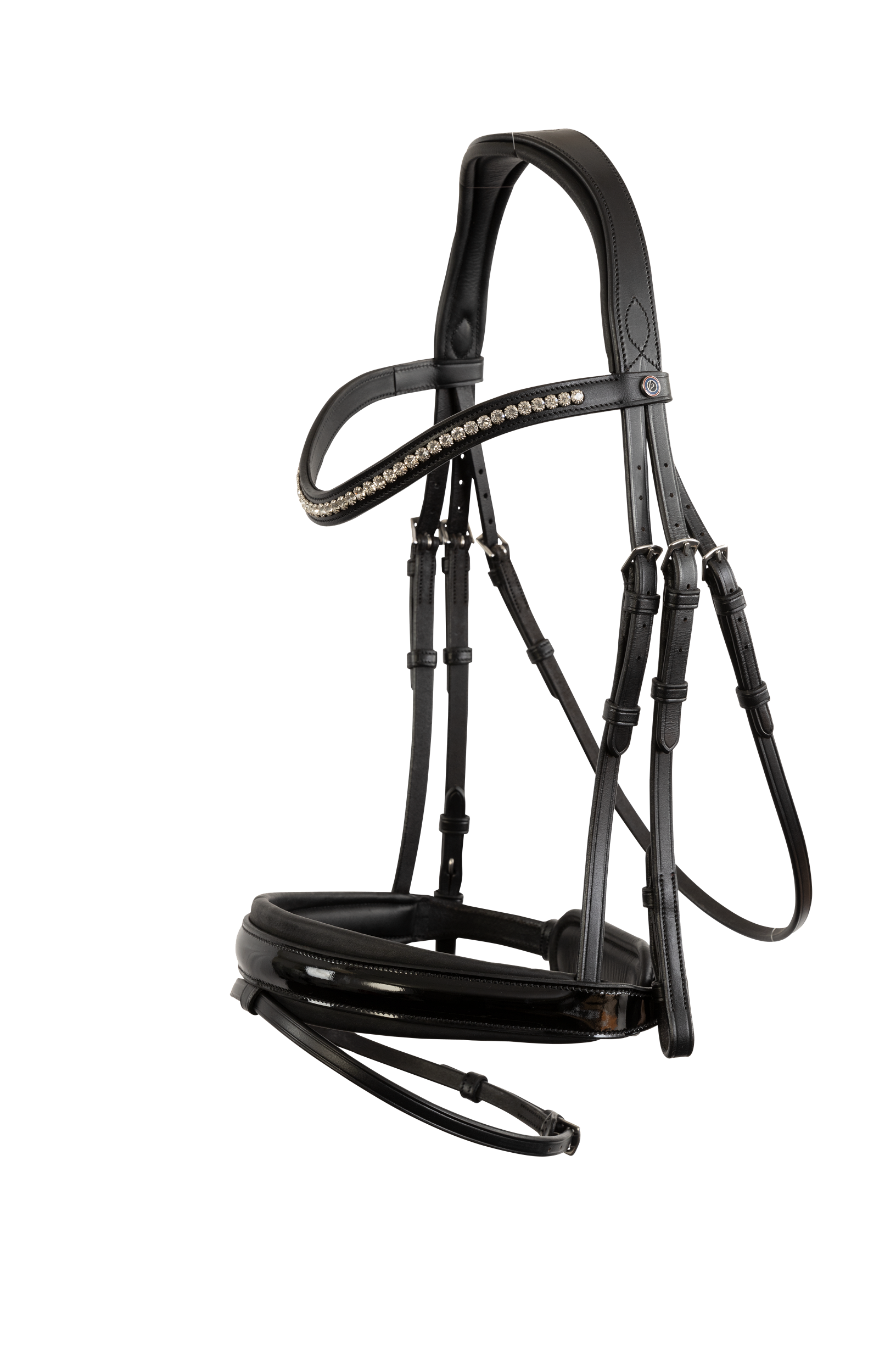 TRUST Vancouver is een elegant hoofdstel met een prachtige afwerking en een mooie pasvorm. Het hoofdstel kenmerkt zich door de dubbele laklederen neusriem. De neusriempadding loopt verder door dan de neusriem zodat de gespen nooit het hoofd van het paard kunnen raken. De frontriem is voorzien van de zuiverste kwaliteit Stellux steentjes wat zorgt voor een elegante uitstraling. Deze steentjes zijn deep-set, waardoor ze er niet uitvallen. Het kopstuk is anatomisch gevormd en teruggesneden voor meer vrijheid bij de oren. De padding van het kopstuk is zacht maar niet te dik, zodat er direct contact is met het paard. De TRUST Vancouver is een musthave hoofdstel voor de dressuurruiter.