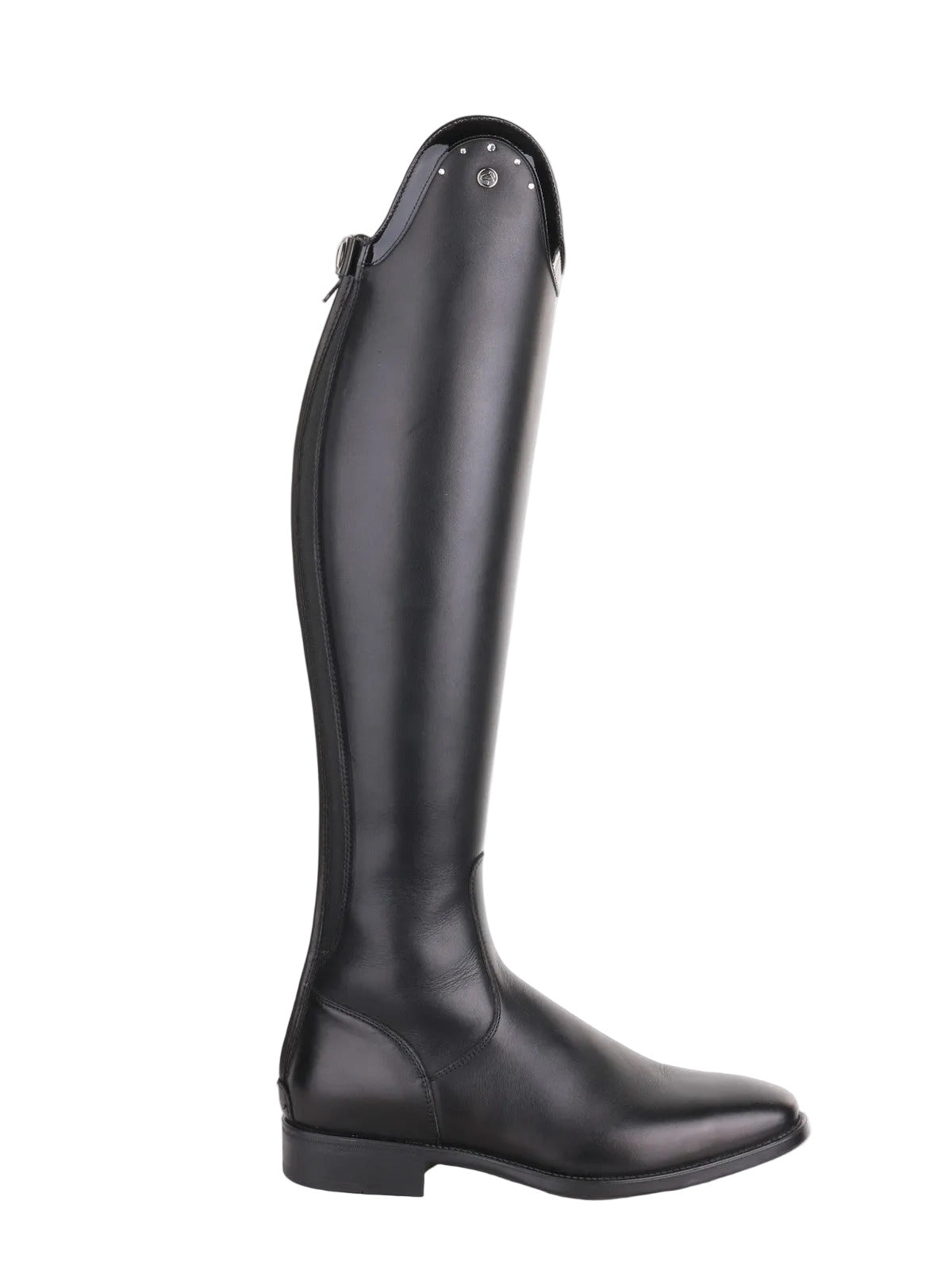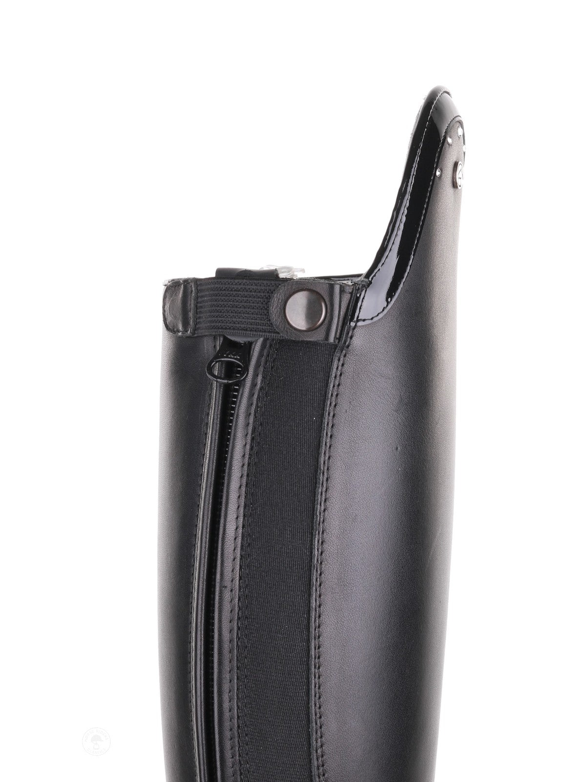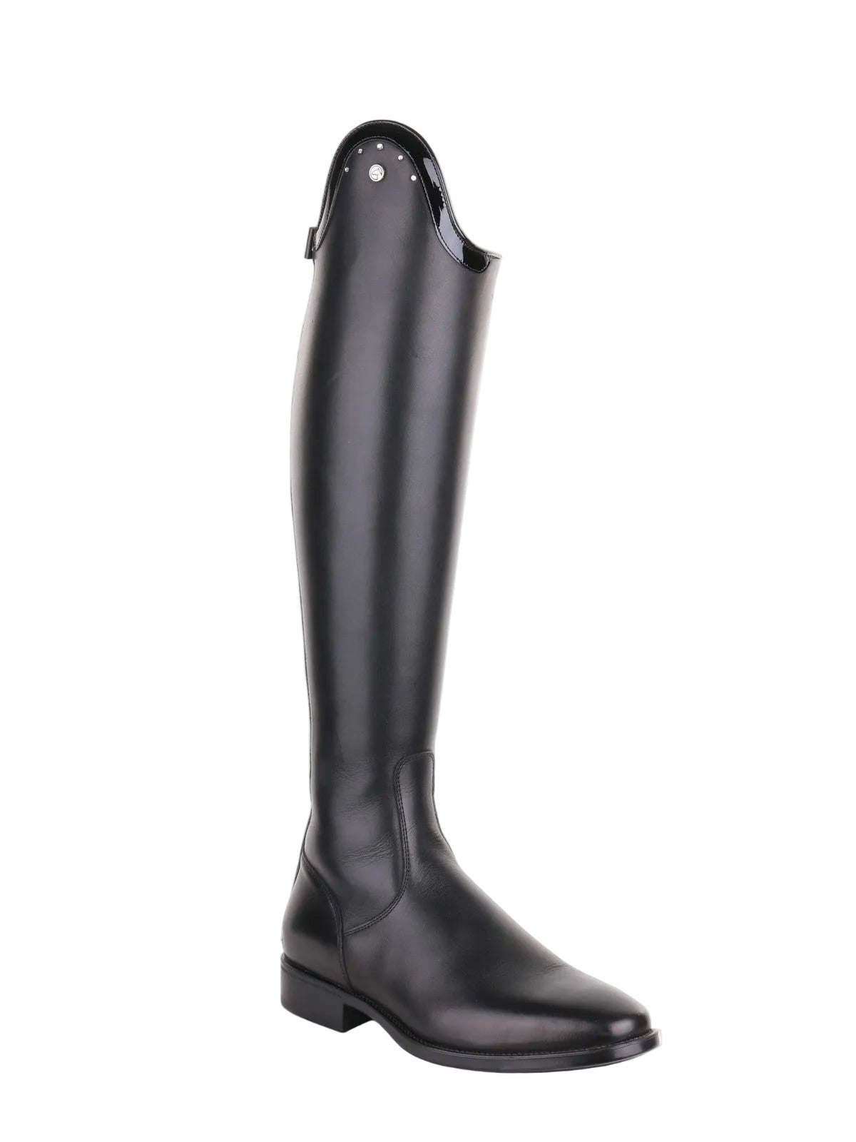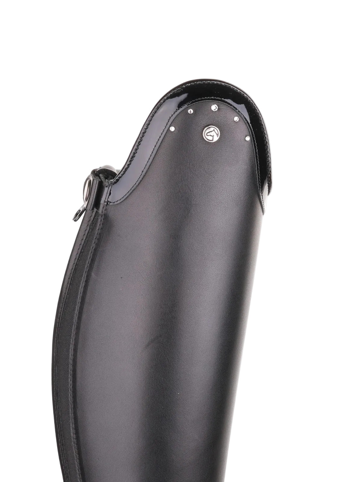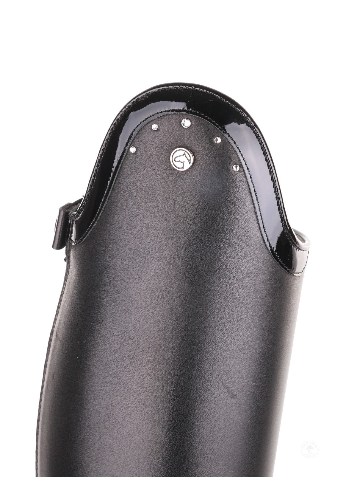 La botte d’équitation Puro Duo présente un dessus en cuir verni orné de cinq cristaux Swarovski transparents pour une allure luxueuse.