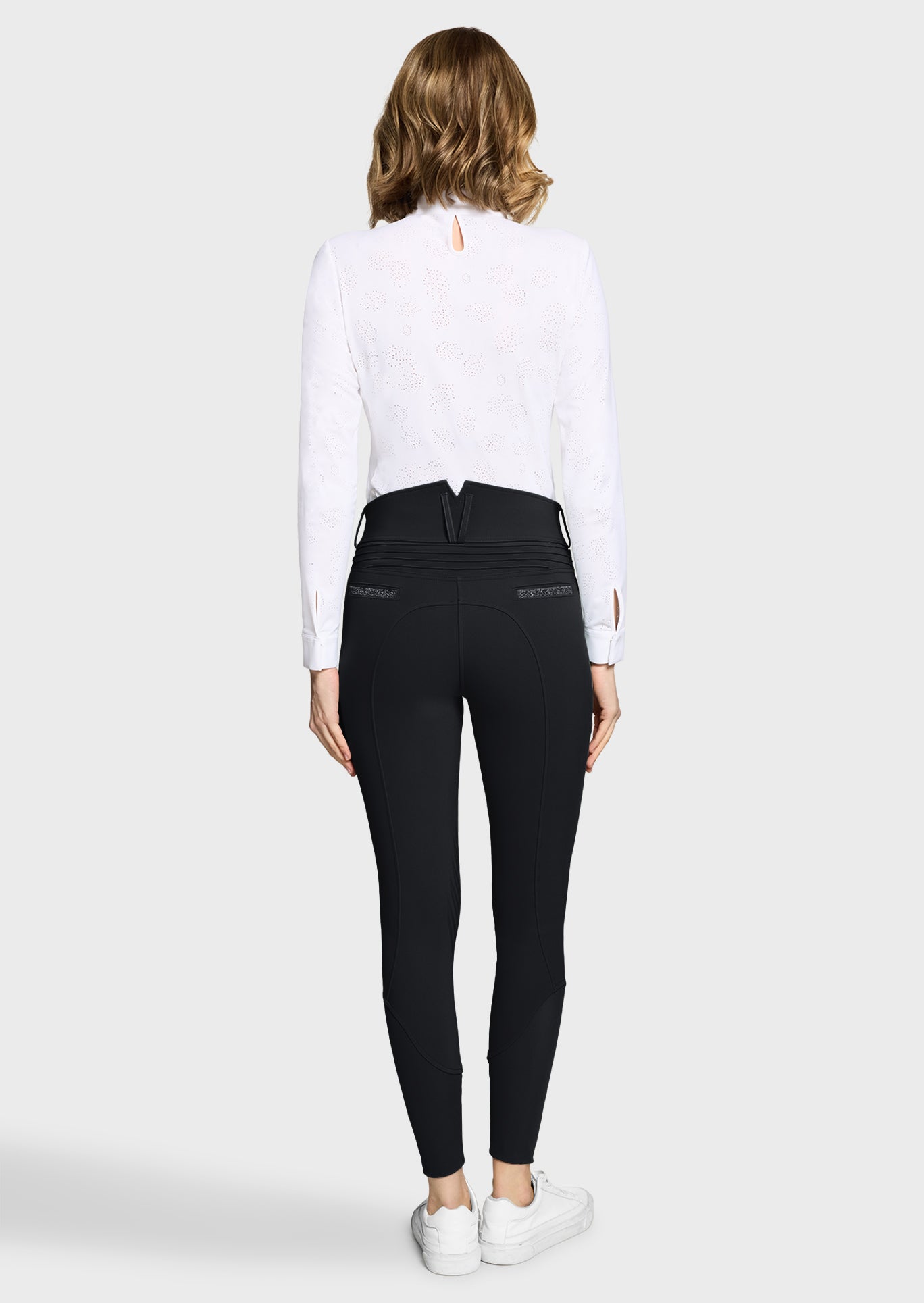 De Claranova rijbroek staat voor de perfecte combinatie van elegantie, technische prestaties en modern design. De extra hoge taille aan de achterkant met een verfijnde V-vorm en contrasterend stiksel accentueert het silhouet en biedt tegelijkertijd optimale ondersteuning in het zadel. De pasvorm sluit mooi aan op het lichaam en zorgt voor maximale bewegingsvrijheid tijdens het rijden.