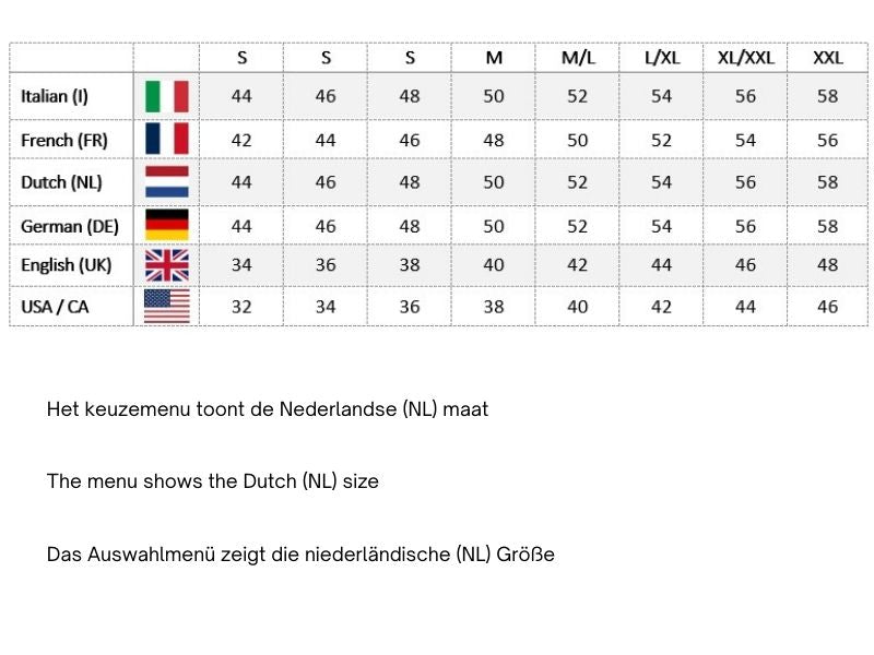 - Belangrijk: we leveren de Franse maat uit. Dit is ook de maat op het label in het jasje. Zie de maattabel voor de vertaling naar andere maten.