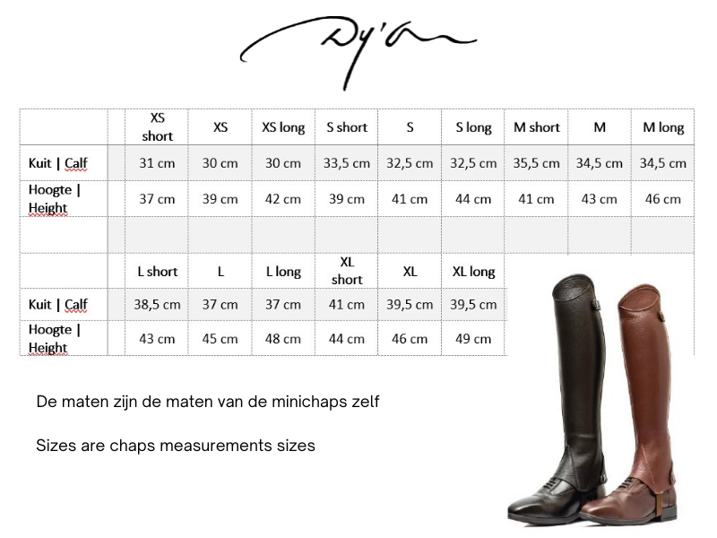 Zie de tab bijlage voor de maattabel. Let op: de maattabel geeft de maximale kuitbreedte aan passend bij die maat minichaps. Ga je over de maximale maat heen, neem dan een maat groter.