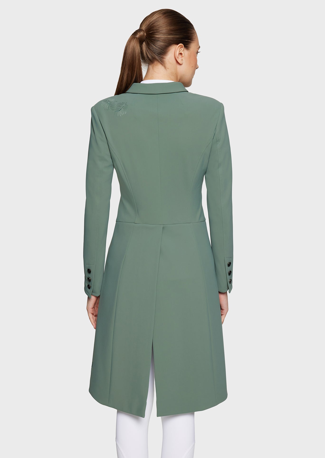 Praktische en technische details maken dit wedstrijdjasje compleet. De compatibiliteit met het Zip’in Airbag systeem zorgt voor extra veiligheid, terwijl de onzichtbare ritssluiting achter de knopen een strakke en elegante afwerking garandeert. Het Samshield-blazoen met Swarovski® kristallen benadrukt het luxe karakter van deze exclusieve frack.