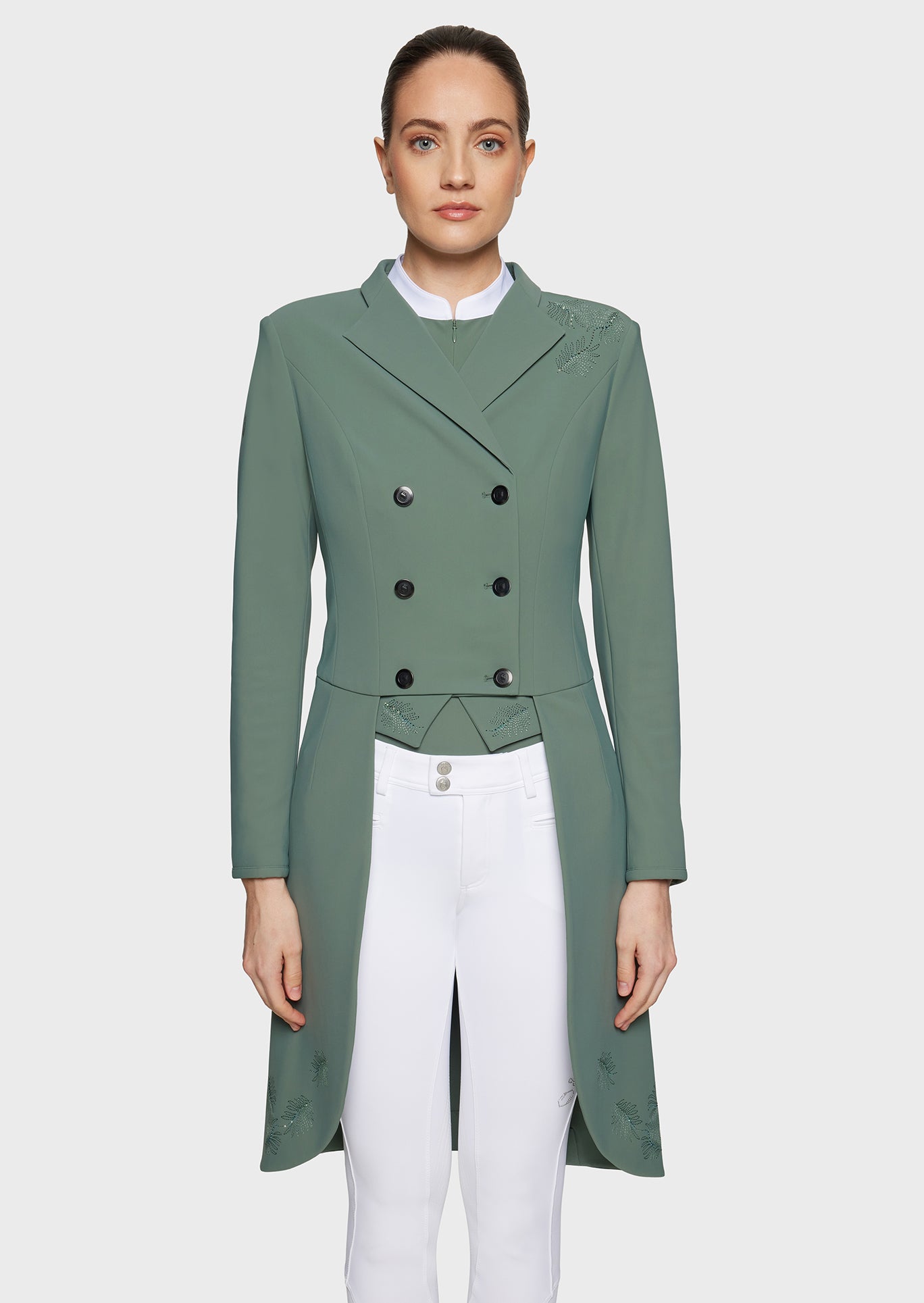 De Samshield Crystal Ferna damesfrack combineert elegantie, prestaties en verfijning in een exclusief wedstrijdjasje voor de dressuurring. Dit hoogwaardige frack herinterpreteert het klassieke ontwerp met een luxueuze uitstraling die perfect past bij prestigieuze wedstrijden. Het geborduurde Ferna-motief, subtiel verrijkt met Swarovski® kristallen, geeft het jasje een verfijnde en licht sprankelende touch.